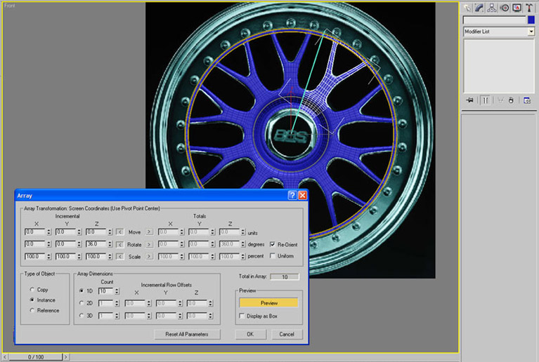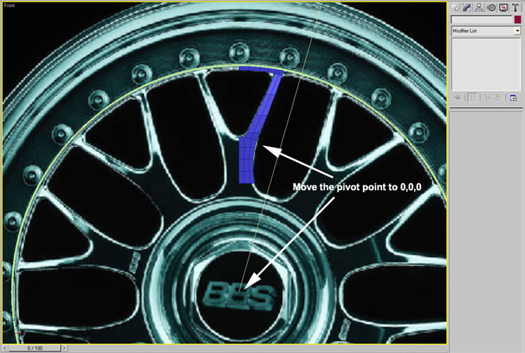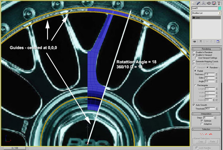 With the Ref pic loaded, again make a plane and convert to an Editable Poly. Move the pivot point to 0,0,0 and make sure the vertices on the left hand side are all at x=0. Also add a straight line spline (using the Snap Toggle) draw from the centre 0,0,0 out. Then rotate this 18 degrees - (360 /10 spokes)/2.