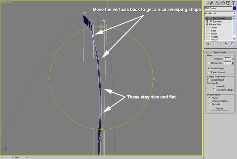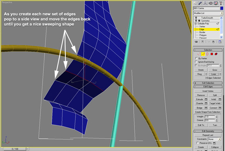 Also as you create each new edge go to a side view and pull the selected edges back until you get the sweeping shape.