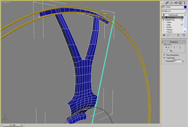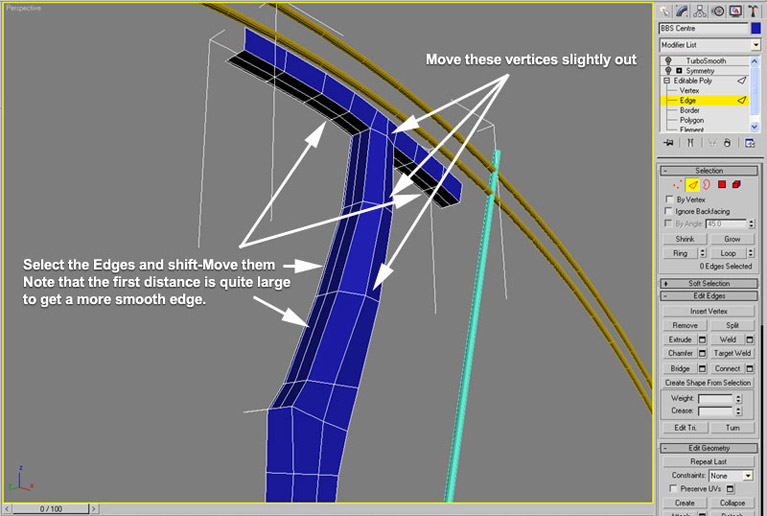 Keep modelling the edges out, keeping the edges within the boundaries - also put a little sweep back to the spoke as it goes to the outer rim - you will see this clearer in the later pics, but do it now as you create new edges up the spoke ! Just move each new set of vertices a little back.