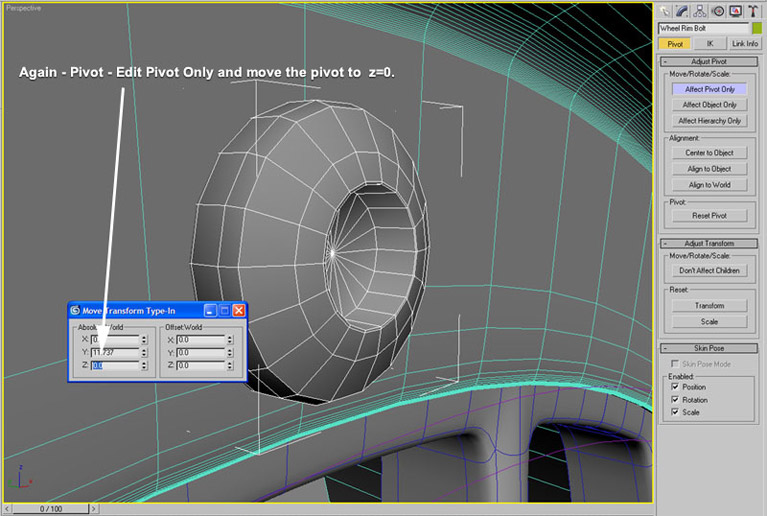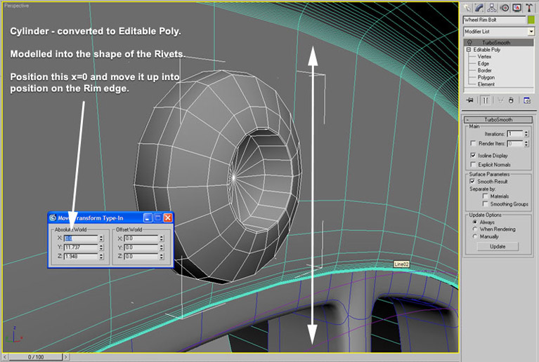 Make sure that this rivet is at x=0 then slide it up and down on the z plane until it is on the rim (push back forward in the y plane also).