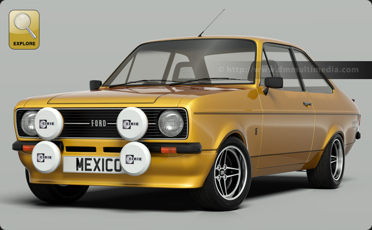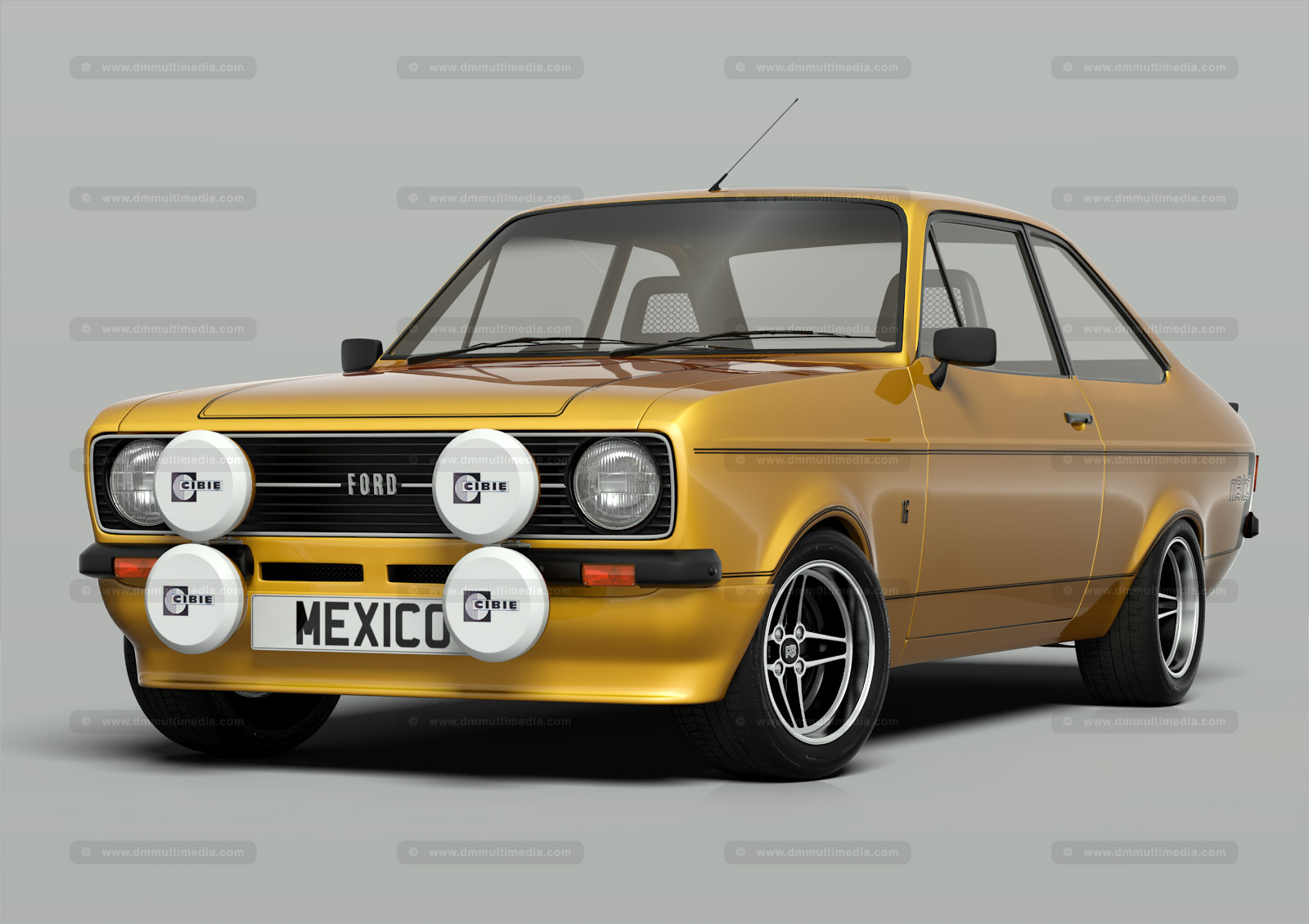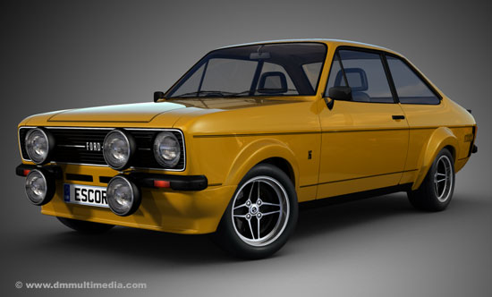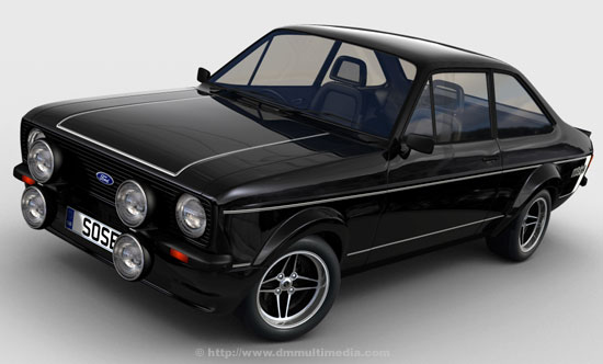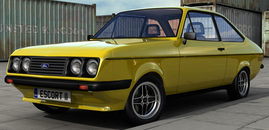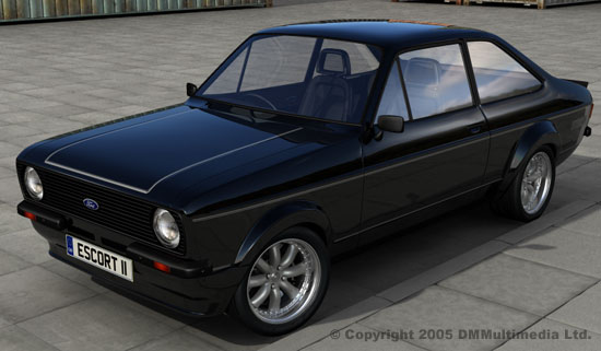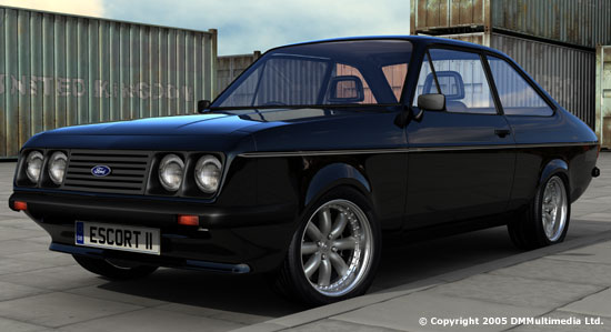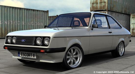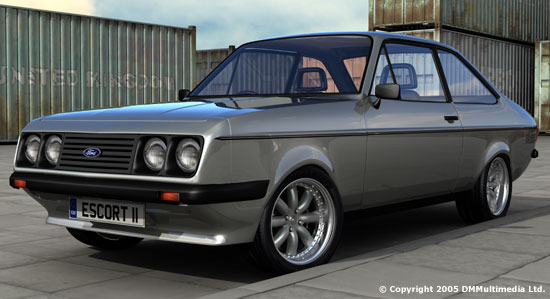 Escort Mk2 RS - Standard 2 door shell, forest arched 2 door shell, droop-snoot RS2000 and Group 5 Zakspeed racer completed. Again with a selection of steel and alloy wheels : standard RS alloy, 7.5 " RS alloys, Image style Minilite, classic minilite, Group5 BBS racing rims. Created with standard RS Mexico pinstriping, slightly modified RS Mexico stripes with cutouts for the forest arches, and standard RS 2000 stripes. Earlier RS1800 and Rothmans colours, along with older images are in the MK2 Workshop section.