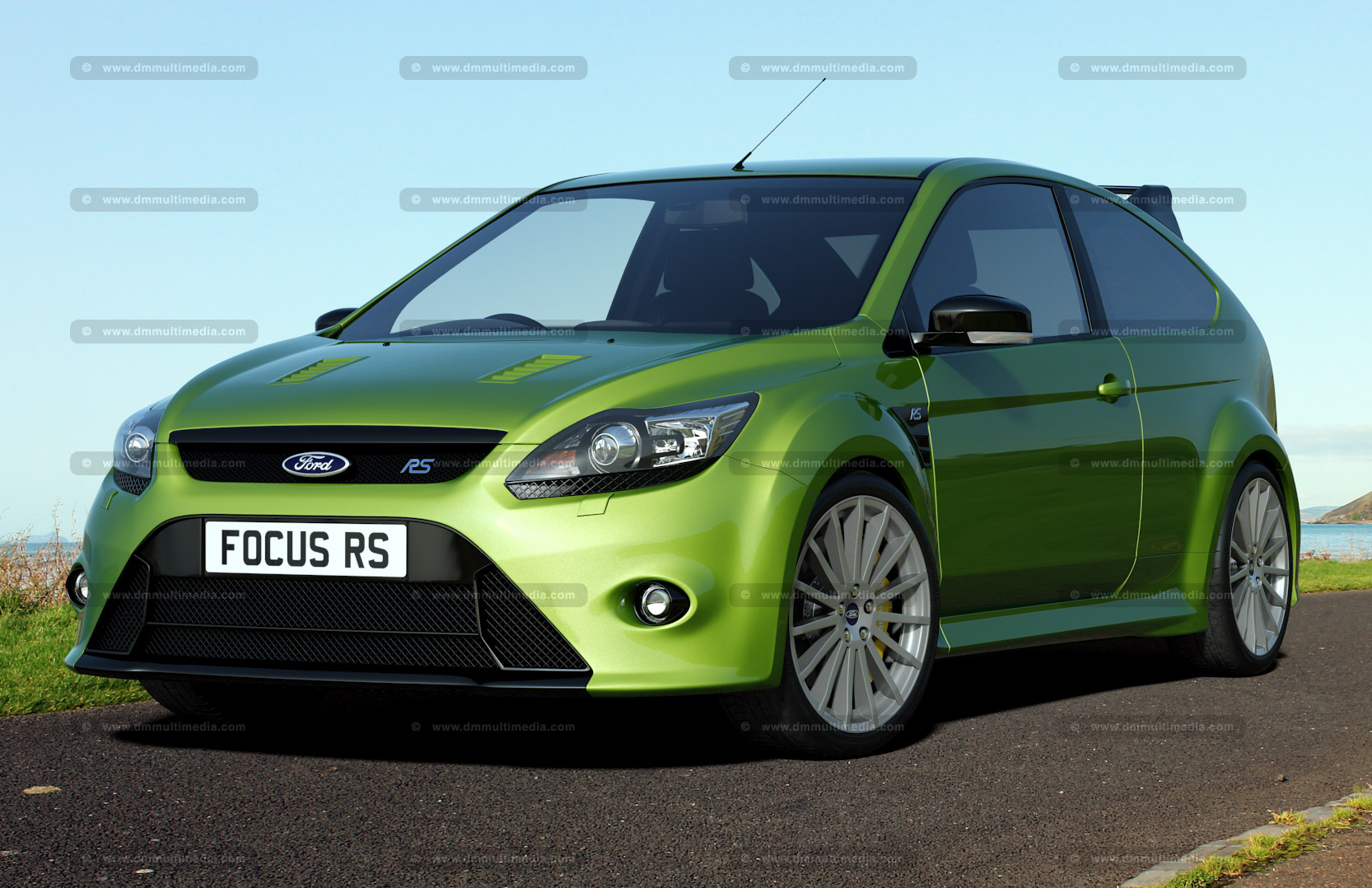 The modern classic - Ford Focus RS MK2. Rendered with standard RS Alloys, but experimenting with both the standard colours (Ultimate Green, Performance Blue and Frozen White) and also a selection of alternate colours. Alloy wheels in gloss black, metallic silver and white. Using a matt black wrap to create the RS500. The Focus model was used by Burtion Power in the UK for the front page of their parts catalogue